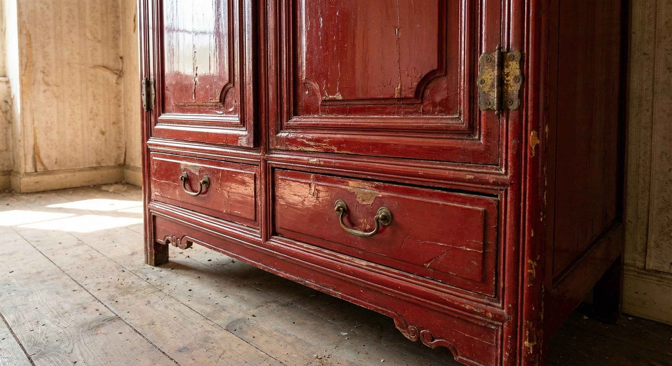 也許是長輩留下來的實木衣櫃,木頭材質極好,但那深紅色的亮面漆,怎麼看都與現代簡約的裝潢格格不入;